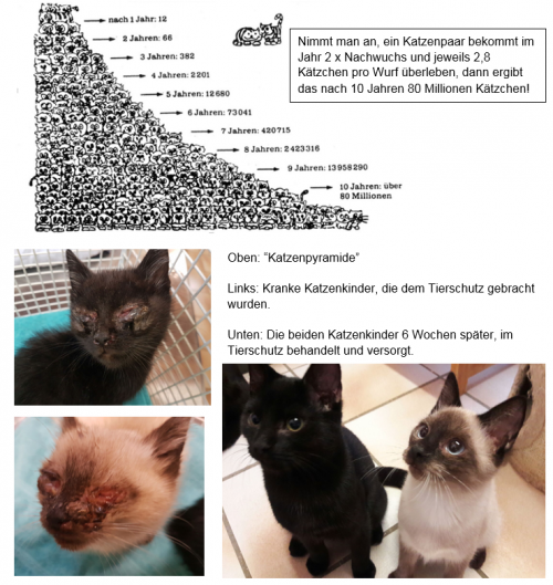 Während eine Katze in menschlicher Obhut und Pflege gut 15 - 20 Jahre alt werden kann, liegt die Lebenserwartung einer freilebenden Katze bei nur 1,5 – 4 Jahren, wenn sie die kritischste Phase als Katzenbaby überlebt hat. Doch trotz der hohen Sterblichkeitsrate steigt die Zahl der Tiere stetig an, denn bereits jetzt, wenn die Tage wieder länger und wärmer werden, werden die weiblichen Katzen rollig. In ca. 63 Tagen - also bereits ab Anfang April - wird der erste Nachwuchs da sein, in der Regel 4 - 6 Junge pro Katze, von denen nur knapp 3 überleben. Eine Katze wirft ca. 2 x pro Jahr und bereits mit ca. ½ Jahr sind die Jungtiere selbst wieder fortpflanzungsfähig. Dadurch wächst die Katzenpopulation sehr schnell, „pyramidenartig“, wie in der beigefügten Zeichnung dargestellt ist.